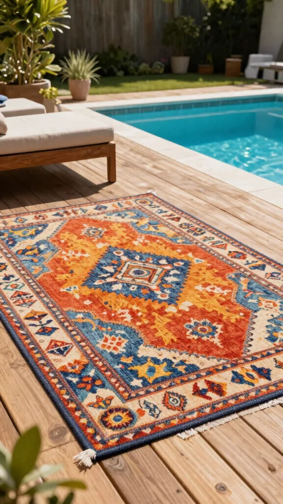 Want to add comfort and style to your pool area? An outdoor rug can provide a splash of color while defining spaces, making your area feel more cohesive. Look for water-resistant rugs with fun patterns or textures that match your style.