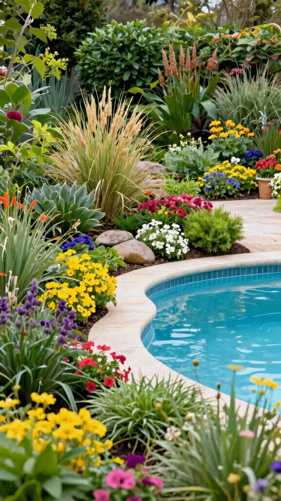 Think about planting vibrant flowers and shrubs around the pool to soften the edges and form a lush border. This not only enhances privacy but also attracts beneficial pollinators like butterflies and bees. Use colorful perennials for lasting blooms, and mix in ornamental grasses for added texture.