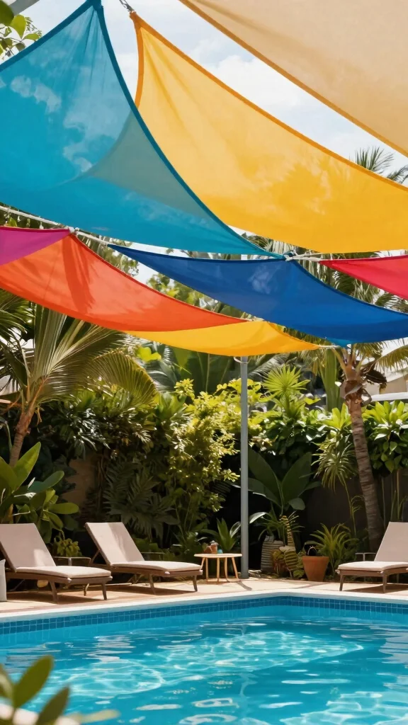 To set them up, choose sturdy poles or existing trees around your pool. Cut your fabric into triangles and attach them securely using strong rope or chains. This not only provides shade but also adds an eye-catching design element to your backyard.