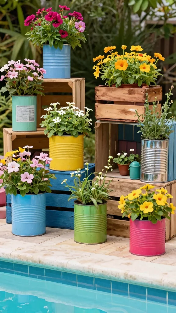 Want to add a personal touch to your pool area? Create upcycled planters using old containers like tin cans, wooden crates, or even broken pots. This project not only adds character but also promotes sustainability by reusing materials.