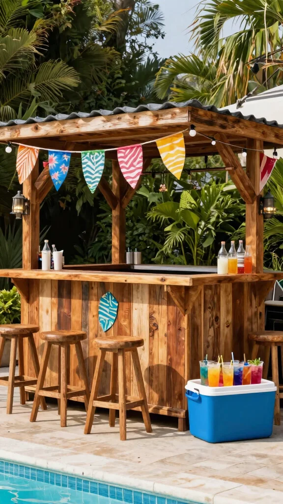 Stock your bar with drinks, snacks, and games like cards or board games for entertainment. Decorate it with string lights or colorful banners to add a festive touch. Don’t forget a cooler for refreshments, perfect for summer gatherings.