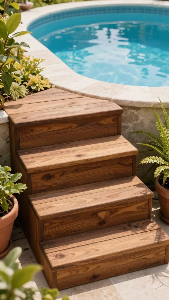 To ensure safety, make the treads wide and apply non-slip finishes. Decorative railings can add extra safety and style, particularly for children and older adults. Wooden steps not only serve a functional purpose but also create a cozy vibe by the poolside.