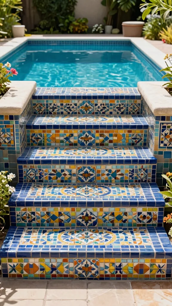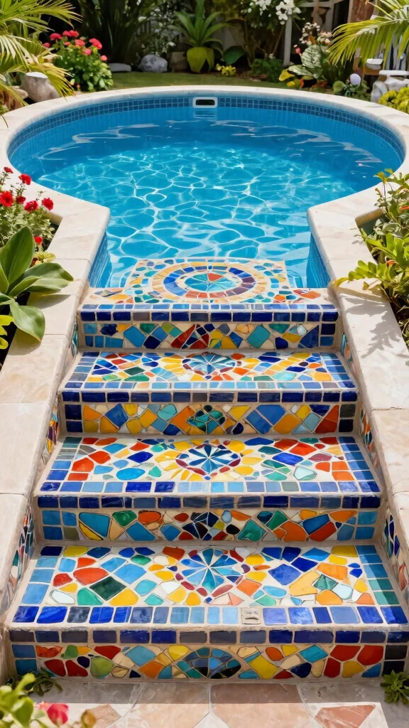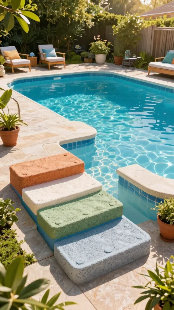 Add a burst of color to your pool with artistic mosaic steps! These vibrant designs can be crafted using tiles, stones, or glass pieces, creating a unique touch for your pool entry. It’s a fantastic way to showcase your personality and create a stunning focal point.