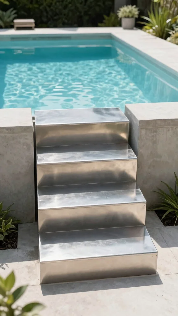If sleek and modern is your style, minimalist metal steps are perfect. Made from stainless steel or aluminum, they offer durability without compromising on elegance. These steps can be customized in various shapes and sizes, fitting your pool perfectly. The shiny finish reflects light, giving a contemporary feel to your outdoor space.