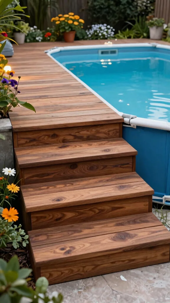 Wooden steps bring timeless charm to your pool entry—a top choice among above ground pool steps ideas. Keep treads wide and add a non-slip finish for safety, then customize the rails to match your deck and vibe.