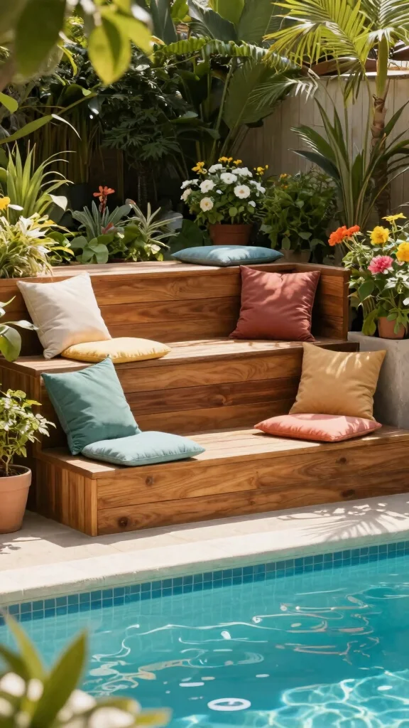 For an eye-catching design, consider tiered steps that add elegance and interest. This style features multiple levels, creating a unique entry point into your pool. You can build these steps from various materials like wood, stone, or composite, allowing for creative flair.