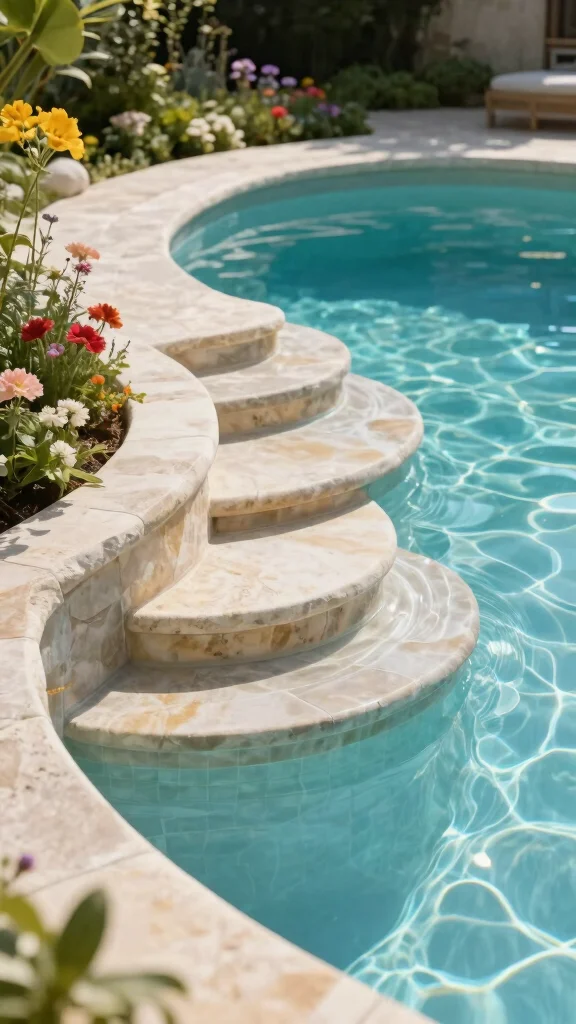 For a gentle, flowing look, consider curved steps leading into your pool. This design softens the overall aesthetic, contrasting with the typical straight lines of most pools. Curved steps can be made from various materials, including stones and composites, mimicking natural shapes in landscapes.