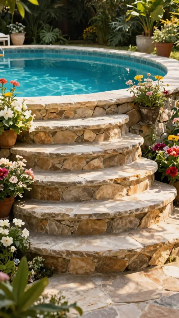 Tiered steps not only enhance your pool’s aesthetics but also make entering and exiting easier. You can use each tier for small planters or decorative elements, maximizing beauty. The cascading effect adds charm while being practical.