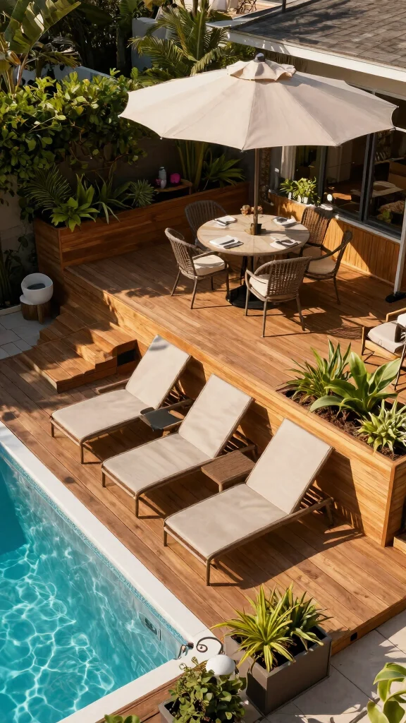 To enhance functionality, think about including dedicated spaces like a sunbed area adjacent to the pool or an elevated dining section. Adding built-in planters can introduce lush greenery, integrating your deck seamlessly with landscaping.