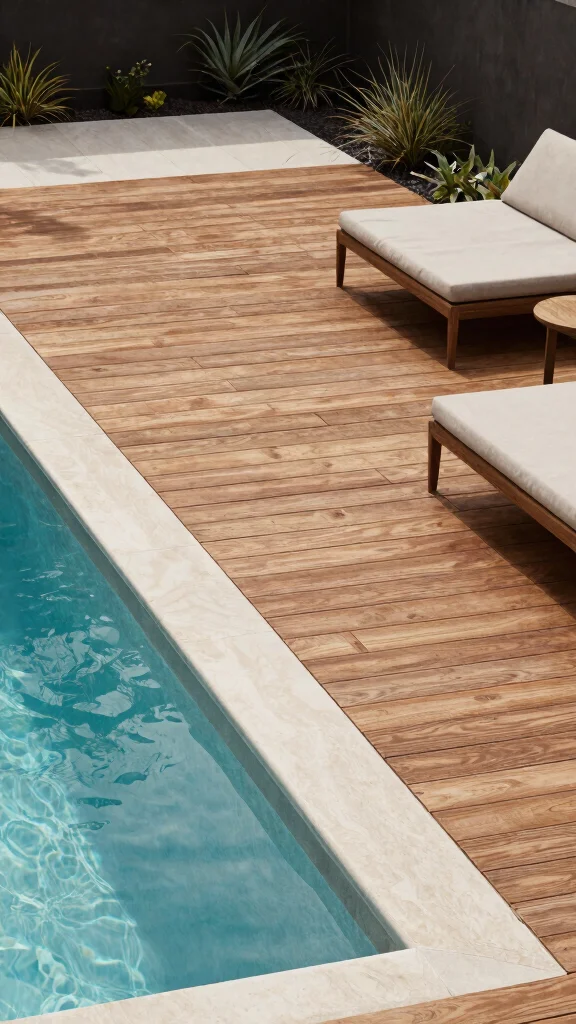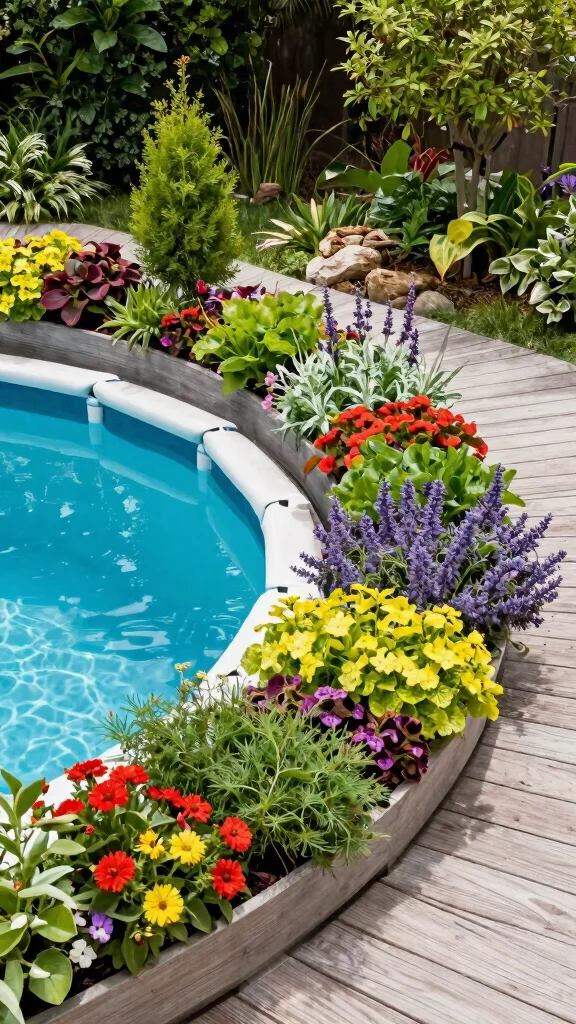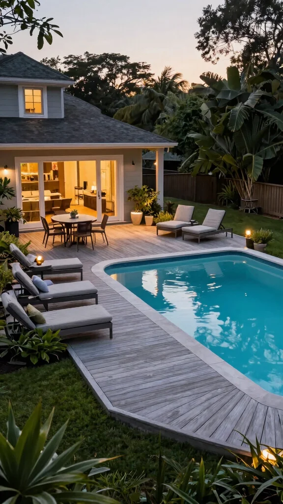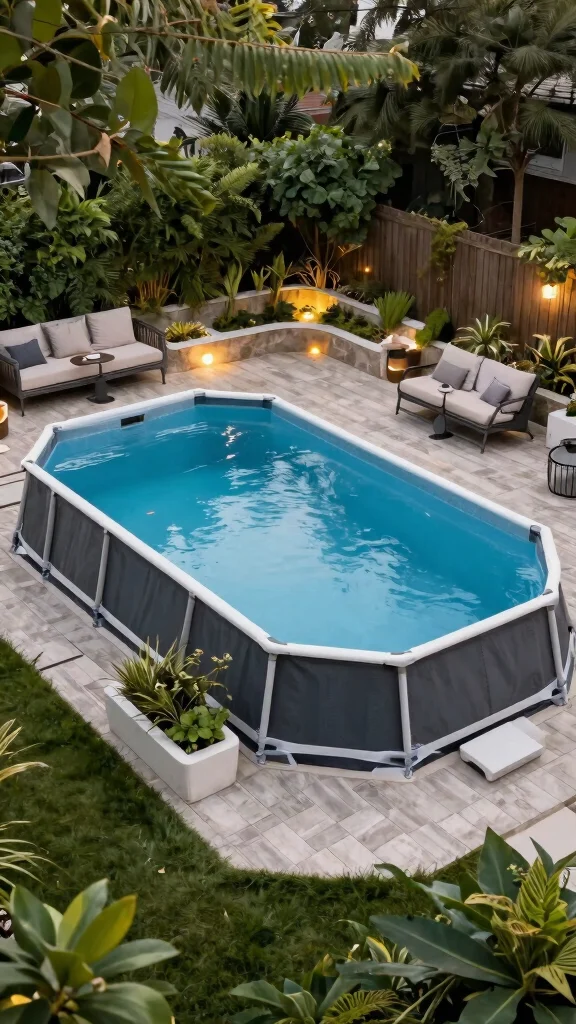 For compact backyards, keep the design simple and functional. Use elevated planters and a few low-maintenance shrubs near the edge, then soften corners with ground cover that blends with your deck color. Choose decking that drains well and dries quickly, like composite, and add a slim border of pavers to delineate the pool area. Install a privacy screen or trellis on the house side to create a sense of enclosure without crowding space. This pool deck landscaping approach supports outdoor living spaces and seamless outdoor transition in a small yard, while keeping above ground pool ideas practical.