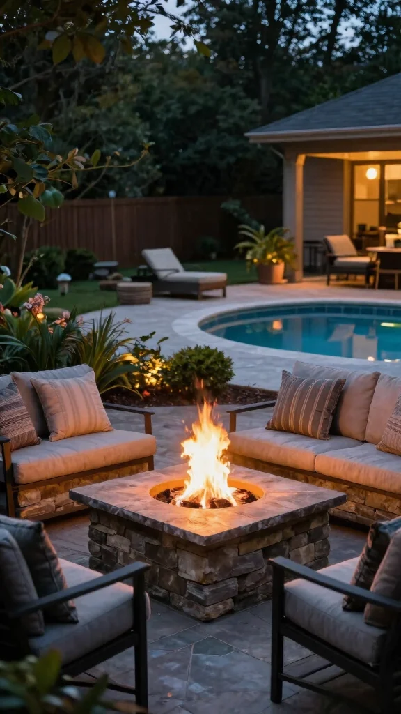 Arrange comfortable seating around the fire pit to foster intimacy, perfect for storytelling or sipping warm drinks. Ensure you use fire-safe materials in your design for safety.