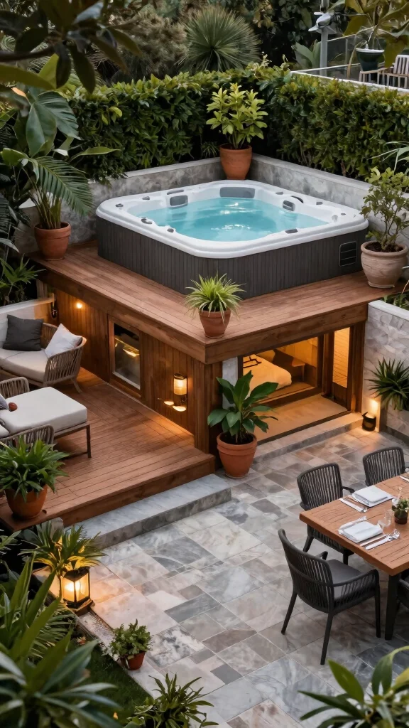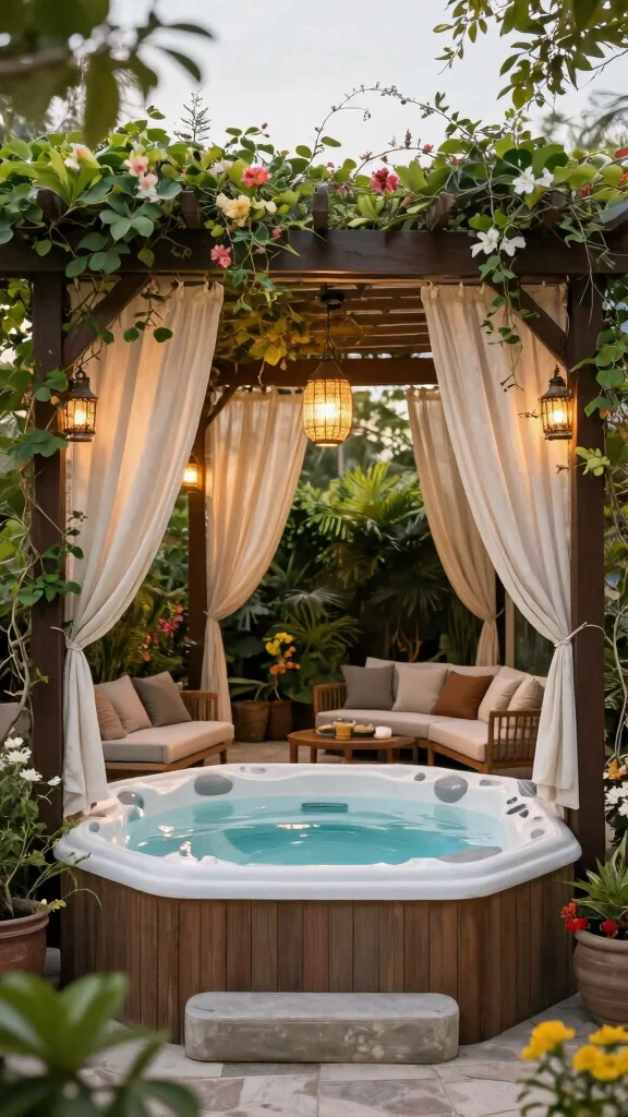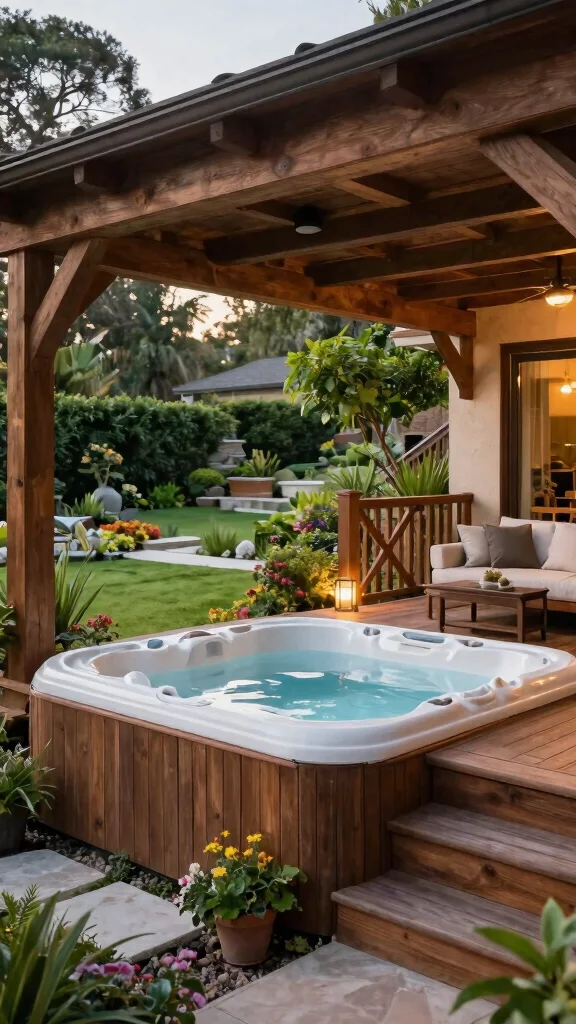 Install privacy screens, trellises with climbing plants, or tall planters to create a cozy cocoon around the hot tub. Add a pergola or partial shade for comfort, plus weatherproof cushions and warm lighting to elevate the mood. Use natural textures like stone and wood to tie your space to outdoor living spaces and garden decor.