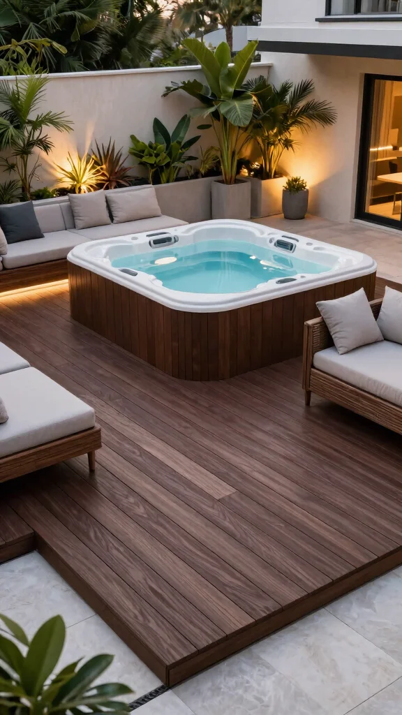 Start with a solid, level base and slip-resistant decking. Leave ample clearance around the hot tub for access and safe entry/exit, and install weatherproof lighting to improve visibility at night. Choose moisture-resistant materials and add a built-in privacy screen or planters that tie into your backyard landscaping and garden decor.