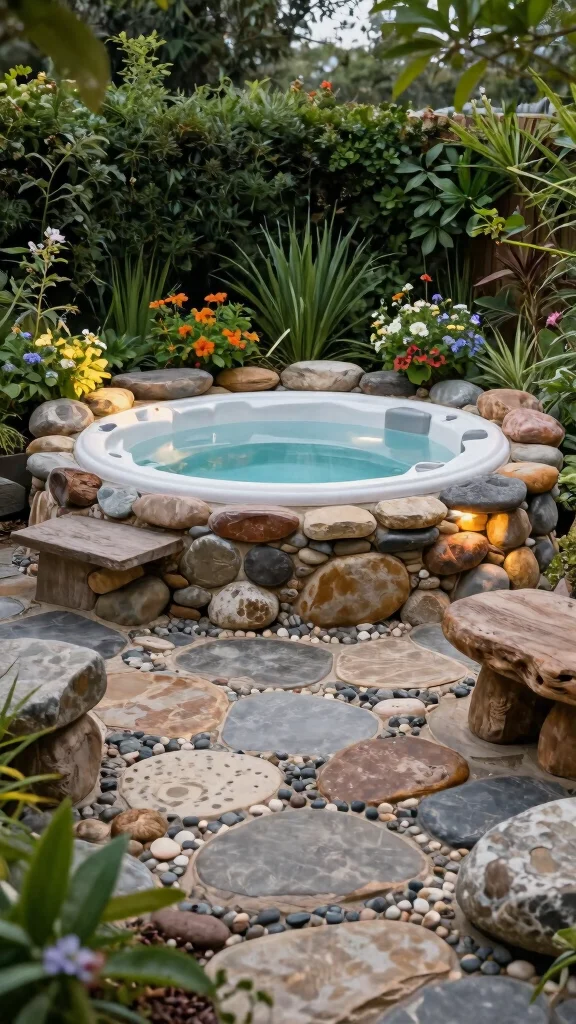A pebble or stone patio can create a serene, spa-like experience that perfectly frames your hot tub.