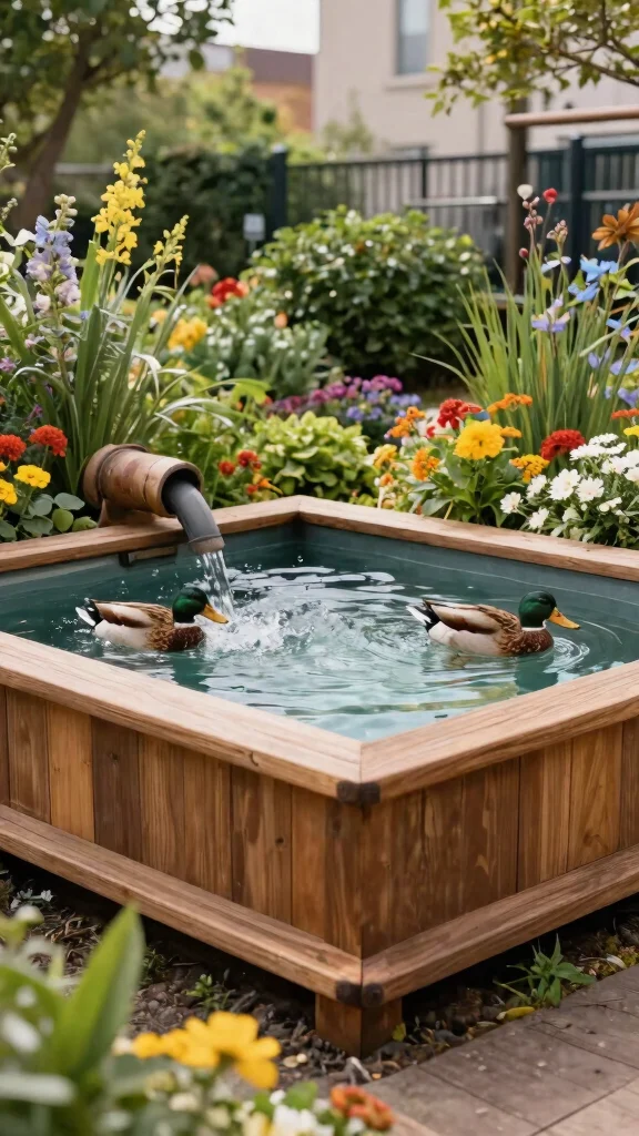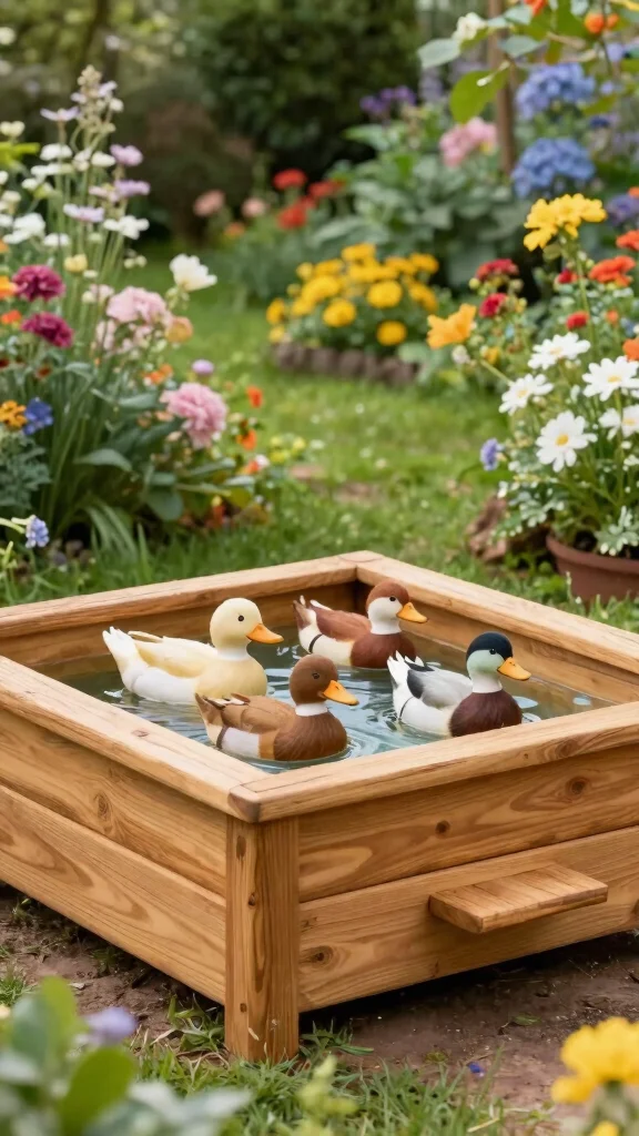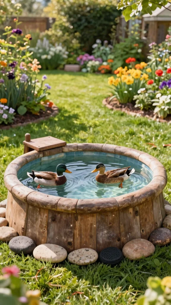 Make sure to use food-safe sealants to keep the water clean, and regularly check for wood rot. This wooden pool provides a cozy habitat for your ducks while enhancing the visual appeal of your garden with minimal maintenance needs.