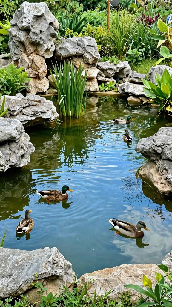 If space permits, consider a natural stream-style duck pool that serves as a captivating focal point in your garden. This design mimics flowing water, enhancing both the beauty and biodiversity of your outdoor area. Use a sloped section to create a gentle watercourse, adorned with stones and plants for a picturesque setting, and implement a drainage system to effectively manage water levels.