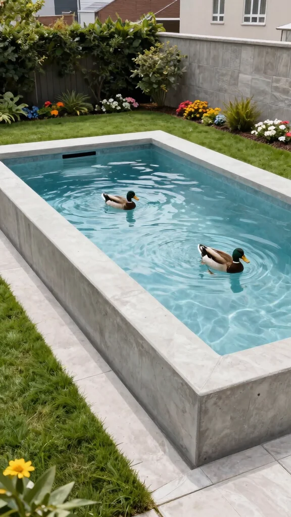 Regularly scrub the pool’s sides to prevent algae buildup, and keep the drainage channels clear to avoid overflow. A concrete duck pool not only offers a modern aesthetic but also minimizes maintenance, making it a practical choice for any outdoor space.
