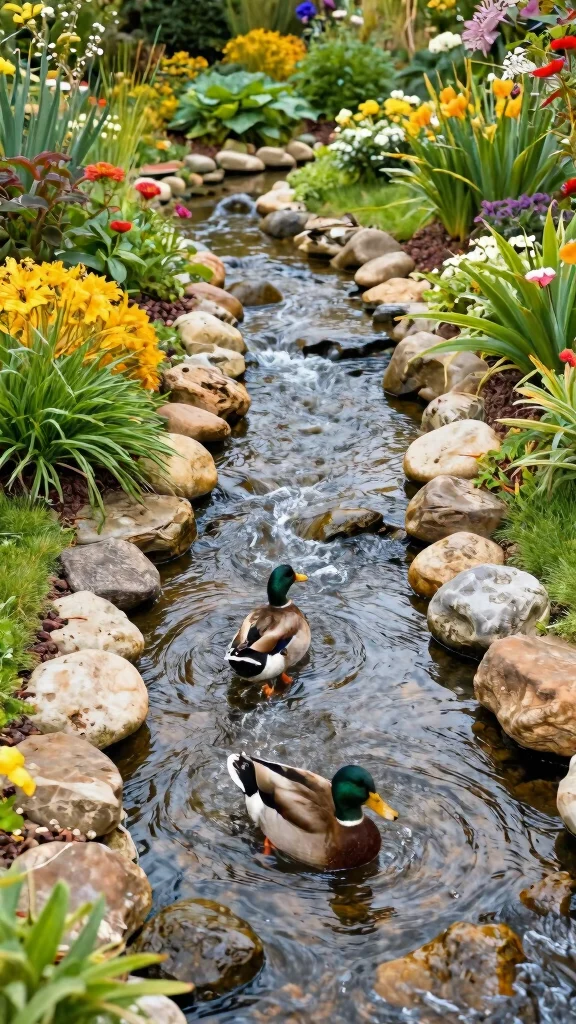 Ensure that the water flow is gentle, creating a calm environment for your ducks and regularly maintain the water quality to prevent stagnation. This naturalistic design not only enriches your ducks’ habitat but also transforms your garden into a serene retreat.