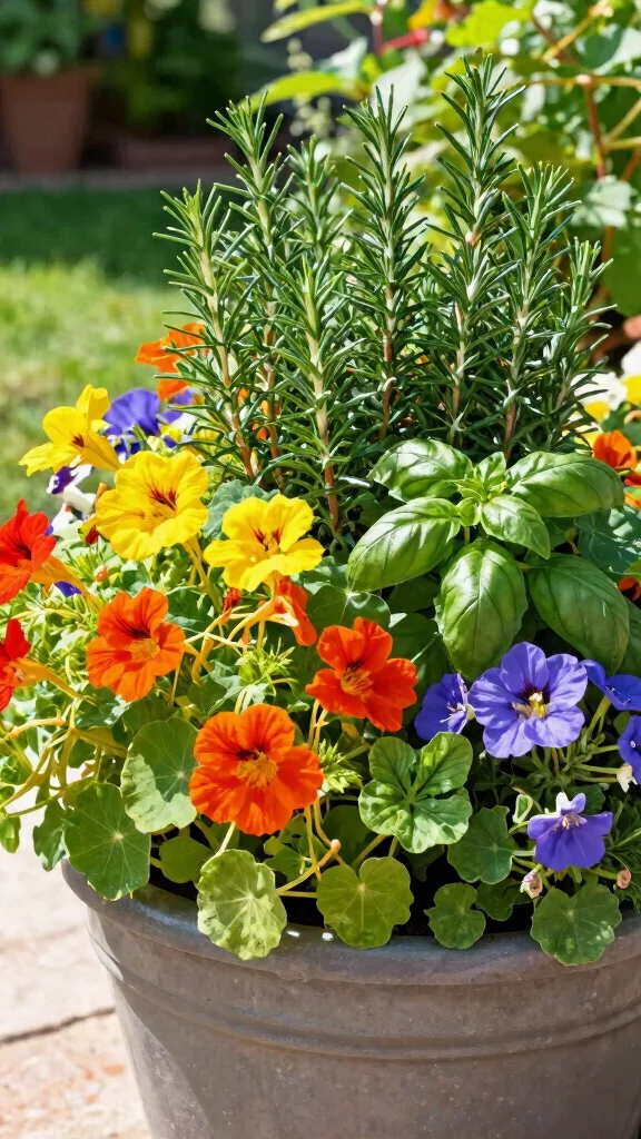 – Mix marigolds with rosemary or chives with violets for a colorful touch.