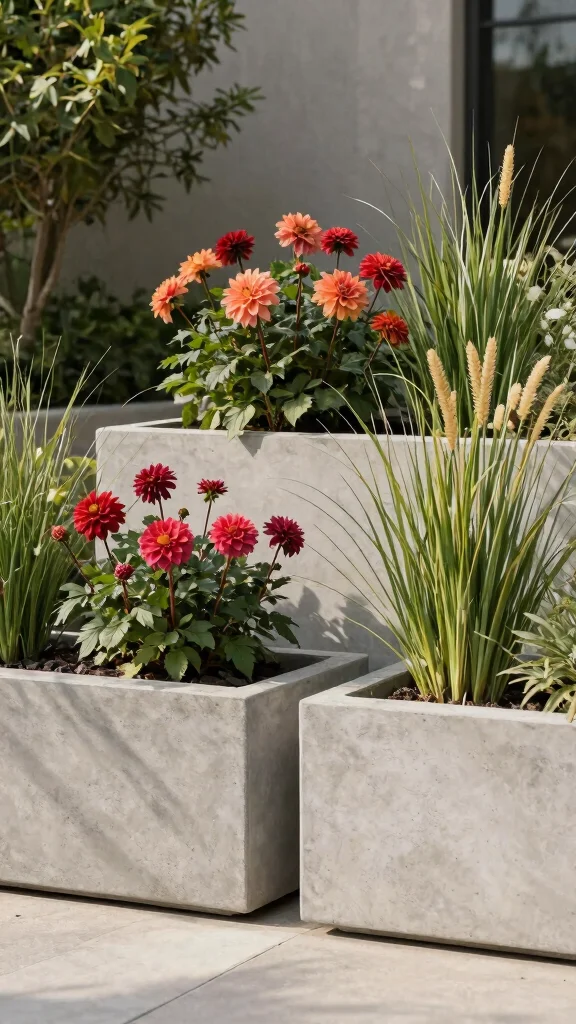 Consider using concrete planters with bold flowers or grasses to play with textures and colors. Grouping different sizes can establish a striking focal point in your garden.
