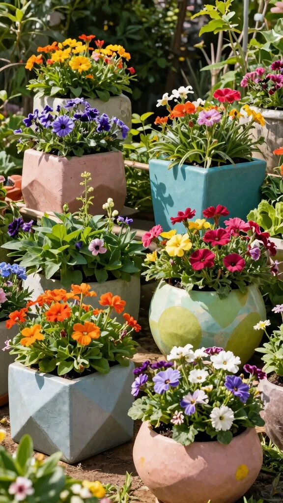 Get creative with placement and shape. Use a mix of verticals and ground-level pots, a couple of oversized decorative pots for anchors, and trailing plants to soften edges. Try odd-number groupings (three or five) for visual balance, and keep a shared color story across containers to look intentional. Use repurposed containers like galvanized tins or wooden crates with liners for a unique, budget-friendly look. Always check drainage and sun needs; with thoughtful creative planter arrangements, a tiny space feels expansive.