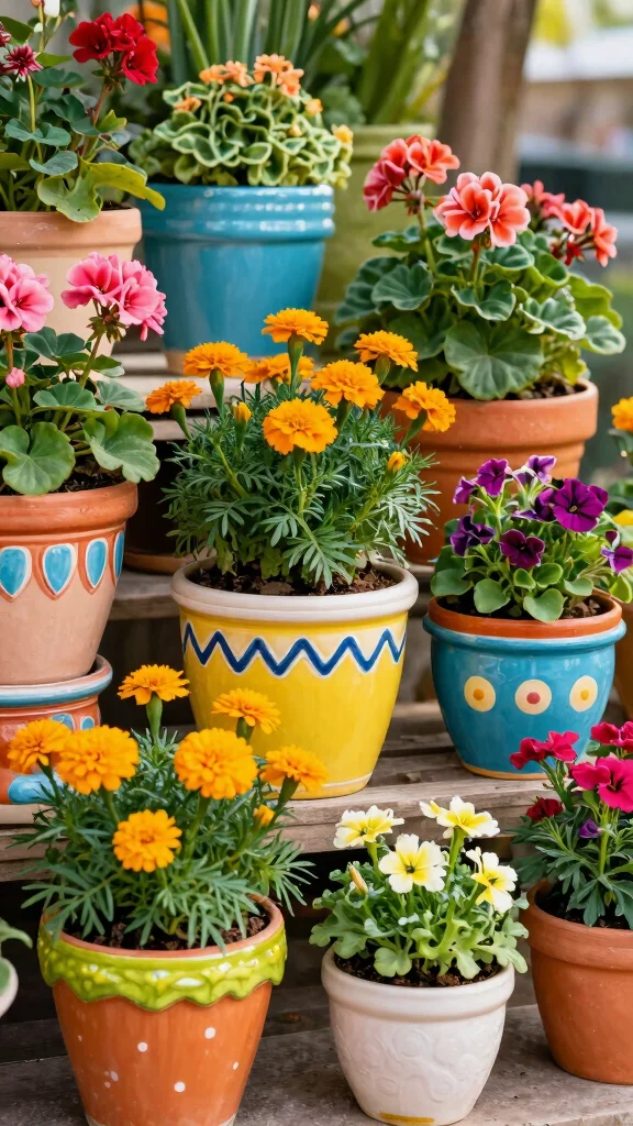 – Pair bright ceramic pots with cheerful flowers like marigolds for stunning contrast.