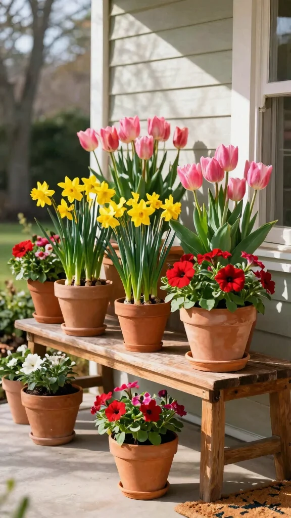 Brighten up your front porch with vibrant seasonal blooms in terracotta pots! These colorful containers are perfect for showcasing flowers like cheerful tulips in spring and striking zinnias in summer. As the seasons change, switch to warm-toned chrysanthemums or elegant pansies for an inviting look year-round. Terracotta’s natural texture pairs beautifully with any architectural style, ensuring your porch always feels welcoming.