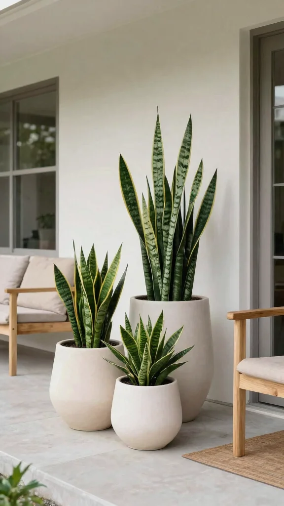 Plants like snake plants or ZZ plants require minimal care and fit perfectly with this aesthetic. Strategically place them around the porch to create balance and tranquility.