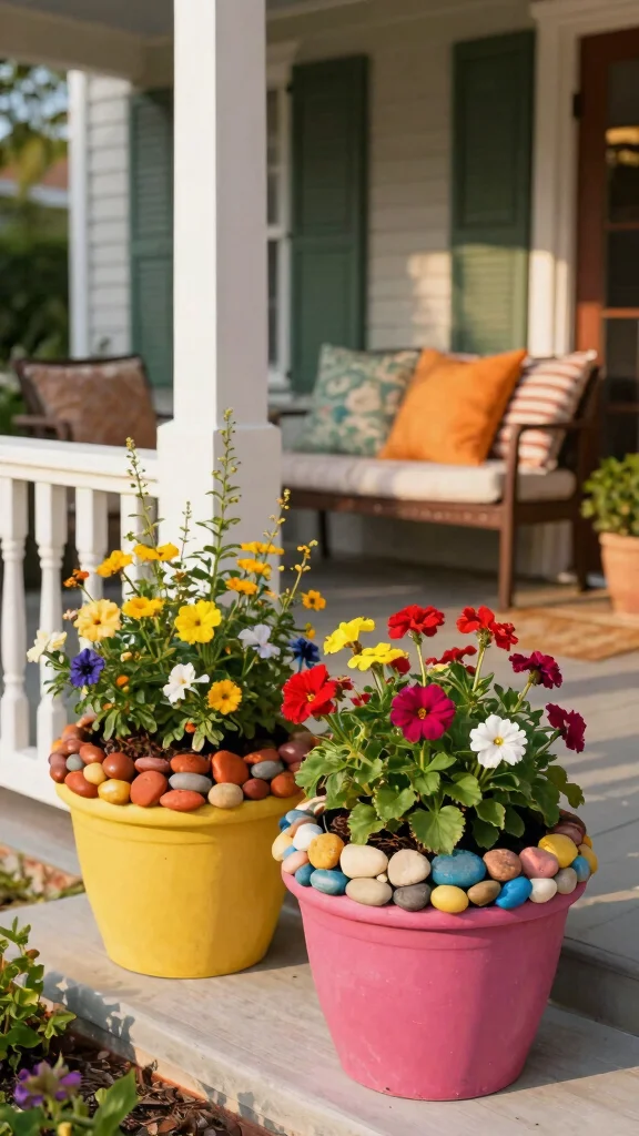 Using pebbles not only retains soil moisture but also makes your planters visually striking. In autumn, opt for rich reds and browns, while bright colors shine in summer.