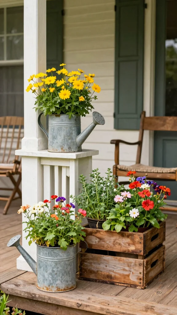 Introduce nostalgia to your porch with vintage-inspired planters. Seek unique items like old buckets, teapots, or antique boxes that can serve as charming containers. These vintage finds add warmth to your decor, making your porch feel inviting and cozy.
