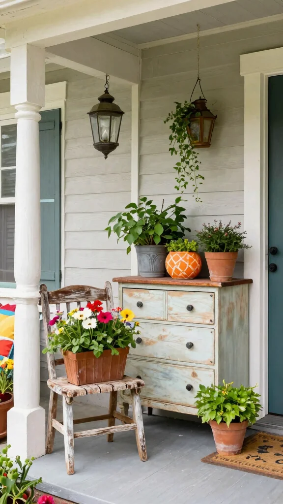 Give old furniture a second life by transforming it into charming planters! Consider cutting the seat out of an old chair and filling it with soil and plants. Or repurpose a dresser into a stunning display of flowers and greenery. This creative upcycling adds character to your porch while reducing waste.