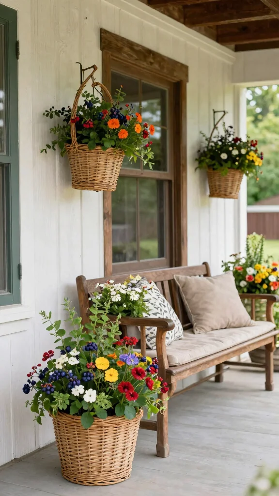 Berry baskets can serve as centerpieces on your porch table or be hung for added dimension. Their versatility makes them a great match for any porch style.