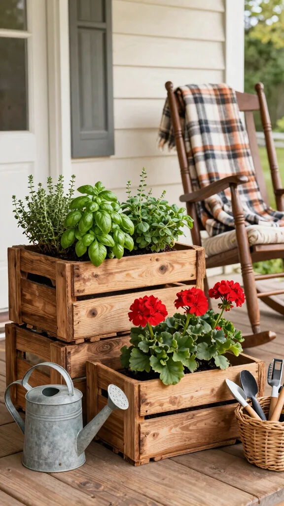 Use wooden crates to create a charming farmhouse vibe that adds character and warmth to your front porch.