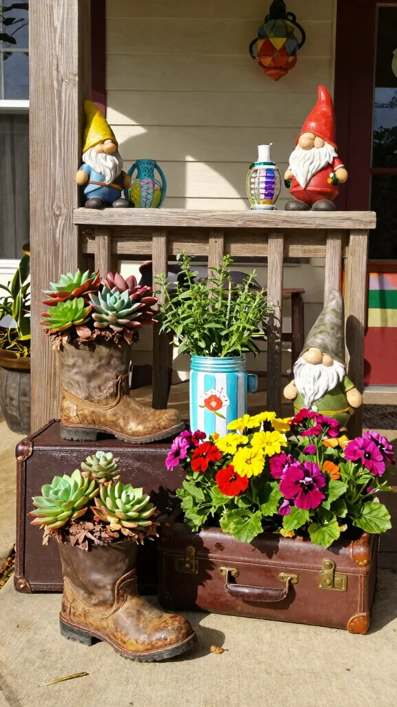Consider filling an old boot with succulents or using a vintage suitcase to display vibrant flowers. These quirky planters can become delightful conversation starters on your porch.