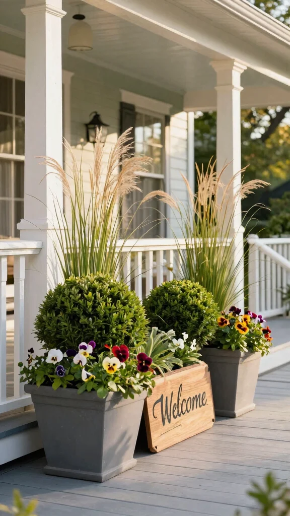 Fun fact: With just 3 seasonal swaps in your front porch planter ideas, you keep a lush entry all year. Start with evergreen elements like boxwoods, then swap in spring blooms and fall foliage for constant charm.