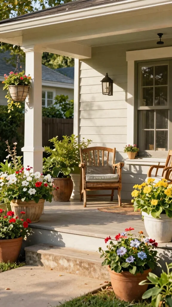 In summer, opt for trailing plants like petunias or strawberries, while fall calls for ornamental peppers or ferns. This vertical approach not only saves space but also brings an inviting garden feel to your porch.