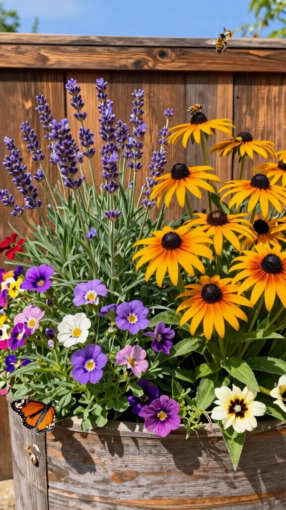Turn your full sun planter ideas into a buzzing sanctuary in your backyard. By pairing lavender, black-eyed Susan, and coneflowers that thrive in full sun, you’ll attract bees, butterflies, and hummingbirds all season—and boost local ecosystems with colorful nectar power.