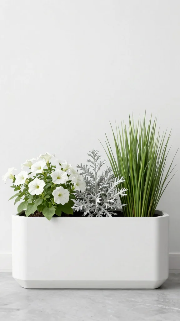 When you choose full sun planter ideas, keep it simple: sleek lines, a monochrome palette, and bold white petunias. A geometric pot lets the plants shine, turning a hot patio into a chic, effortless focal point.