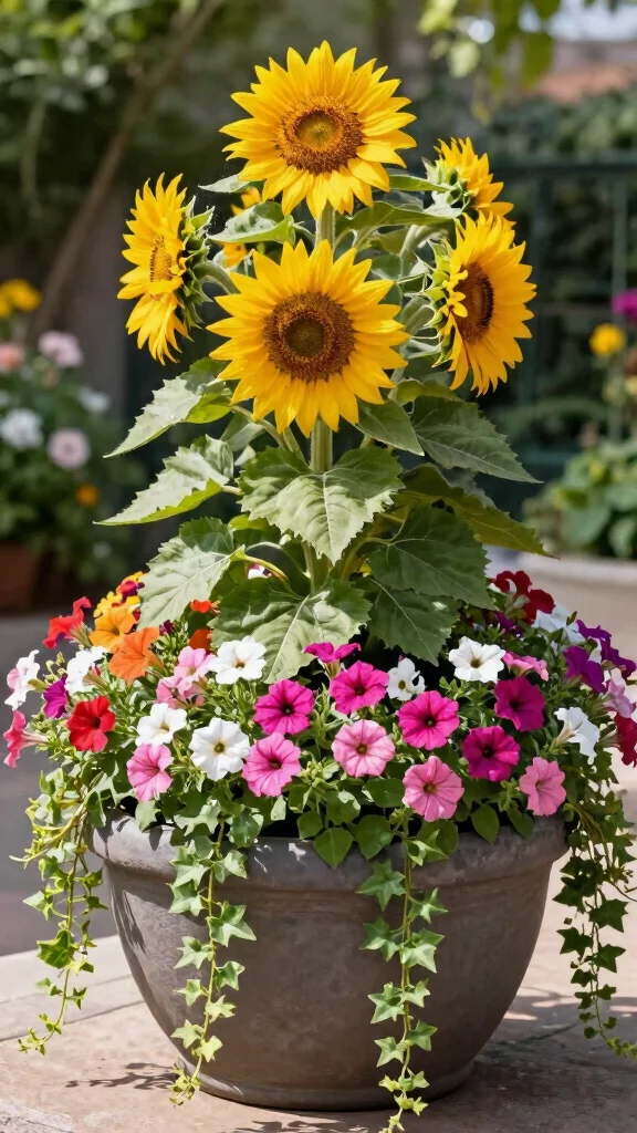 Create a dynamic display by layering plants of different heights in your full sun planters. Pair tall blooms like sunflowers with medium-height plants such as petunias and trailing plants like ivy or bacopa. This technique adds visual interest and maximizes your garden space.