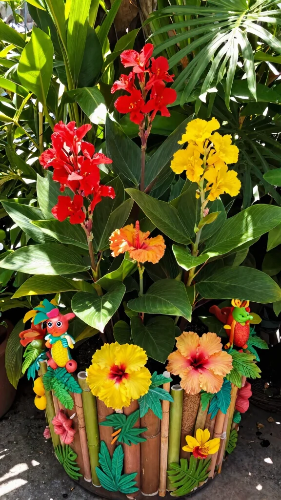 Position your planters in sunny spots and enhance the tropical vibe with accessories like bamboo stakes or colorful ornaments. Layering plants adds depth and interest to your display.