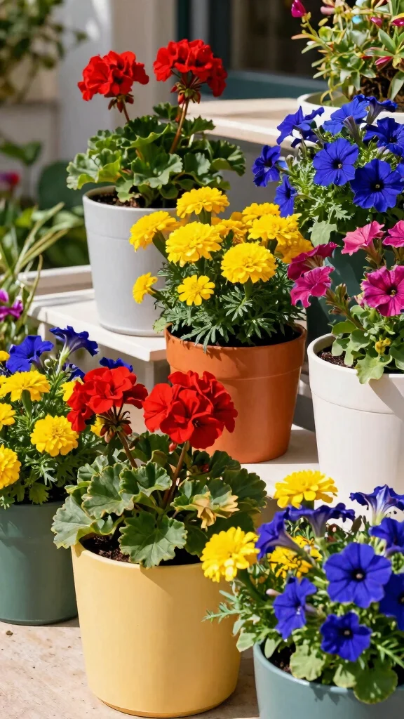 – Key features: Petunias offer an array of colors and can cascade beautifully from containers. They bloom profusely, providing a colorful and cheerful display.
