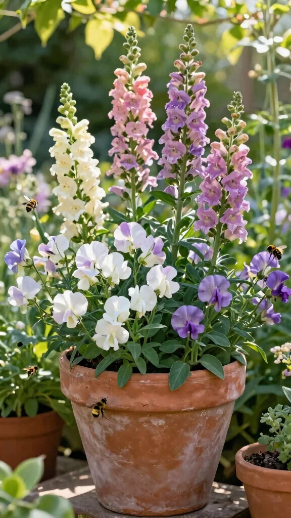 Embrace the charm of a classic cottage garden in your full sun planters with timeless blooms like sweet peas, snapdragons, and foxgloves. These flowers flourish in sunny spots, offering an enchanting mix of colors and scents.