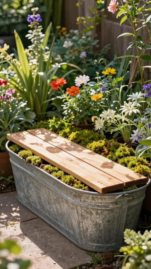 Why not repurpose a larger galvanized tub into a unique garden bench? Fill the tub with soil and create a comfortable cushion using moss or soft plants. Add a sturdy wooden plank or a comfortable seat on top for a rustic bench that invites relaxation.