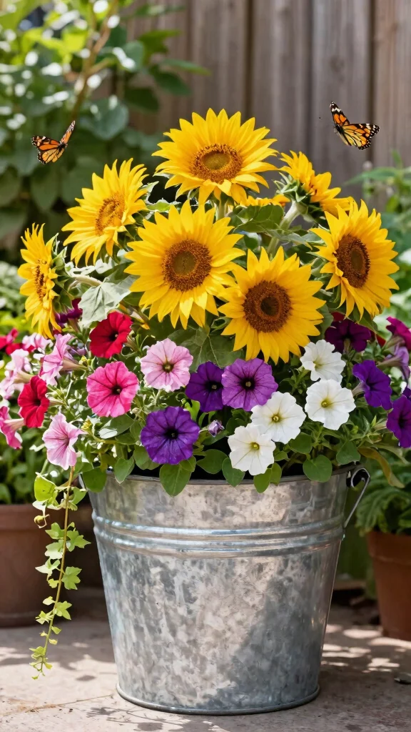 Arrange your plants thoughtfully, with taller varieties in the center and trailing flowers cascading down the sides for a layered look. To enhance the charm, incorporate trailing vines like sweet potato or ivy to soften the edges. This floral display not only beautifies your surroundings but also invites butterflies and bees, enriching your garden’s ecosystem.
