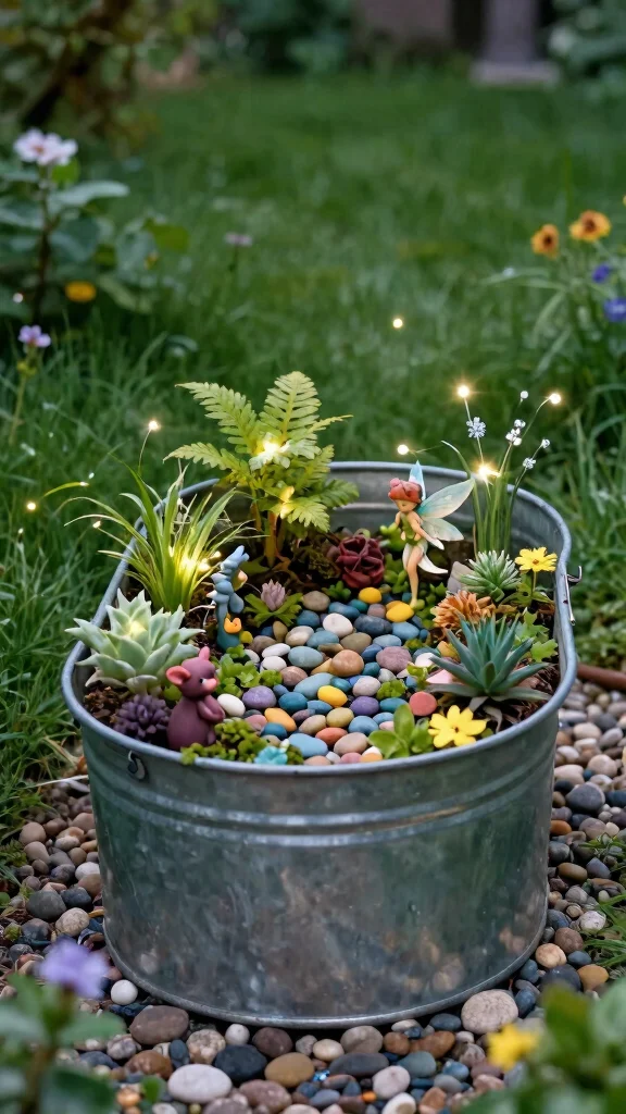 Bringing a touch of magic to your outdoor space is easy with a fairy garden crafted inside a galvanized tub. Choose a medium-sized tub and fill it with soil, rocks, and mini plants like moss or tiny varieties of greenery. Add whimsical figurines, tiny birdhouses, and colorful pebbles to create an enchanting miniature world that sparks the imagination.
