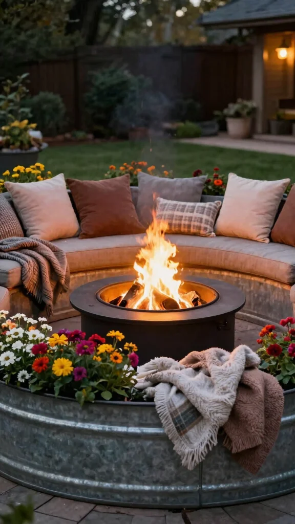 Enhance the warmth and coziness of your evenings by surrounding your fire pit with rustic galvanized tubs. Fill these tubs with colorful flowers or decorative stones to create a stylish outdoor seating area. They can double as planters and seating—just add cushions on top for comfort.