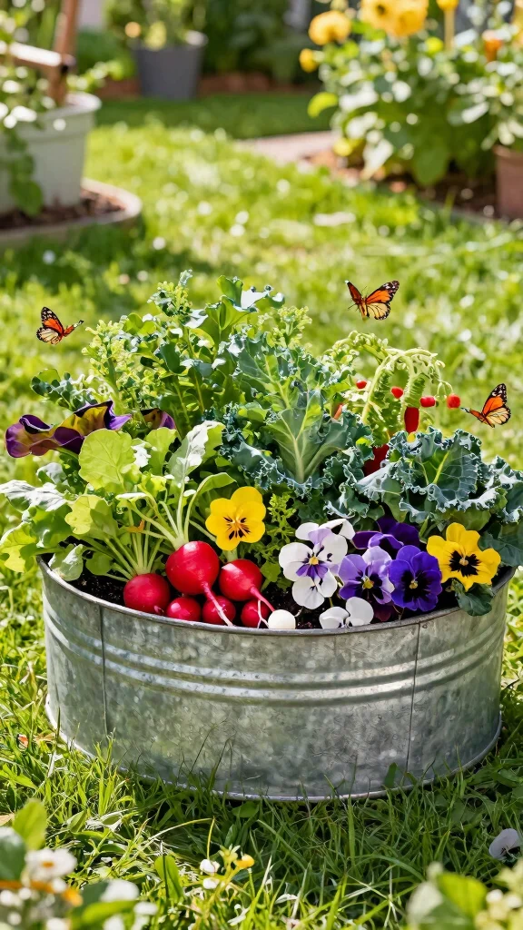 Why not blend beauty with practicality by incorporating edible plants into your garden using galvanized tubs? Fill them with colorful vegetables and herbs that serve both decorative and functional purposes. A mix of leafy greens, vibrant radishes, and beautiful edible flowers creates a stunning contrast to the metal.