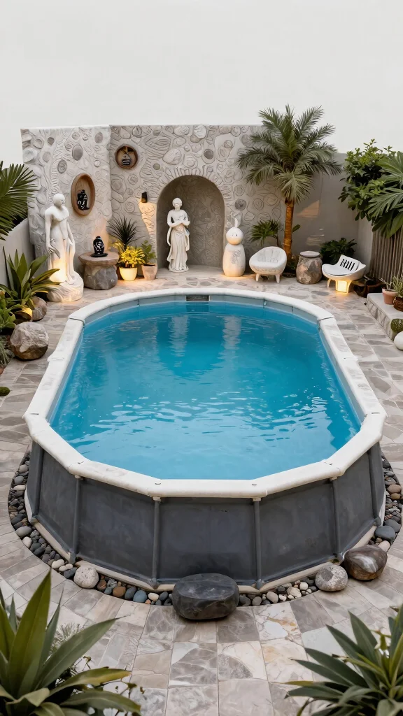 Transforming your half deck around above ground pool into a tiny gallery isn’t just decor—it’s a conversation starter. Arrange sculptures with rhythm, textures, and nature, and watch guests linger, admiring how art and water blend into a calm, stylish retreat.