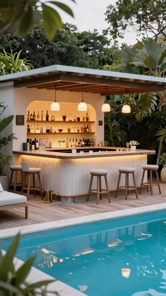 The built-in bar can hold your favorite drinks and snacks, making it perfect for summer parties. Adding bar stools creates a casual vibe, and pendant lights overhead can enhance the festive atmosphere.