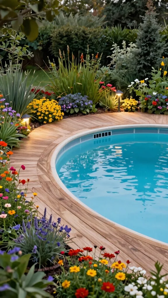 Focus on compact, layered planting and smart container choices to keep the space open. Use container gardens and border planters along the deck to create a green edge and privacy while preserving easy access to the pool. Incorporate garden decor for pools like lanterns or a small fountain to tie the space to your yard. Add subtle lighting and consider a simple path to connect to outdoor living spaces beyond the pool.